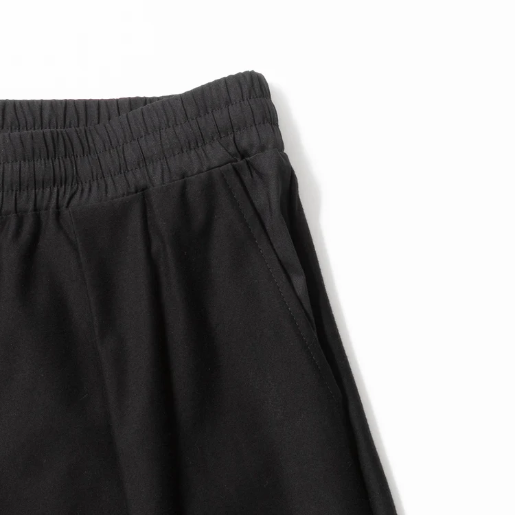 ウエストは気軽なイージー仕様。蒸れやすいウエスト部分とポケット内側に使った和紙混紡生地は、通気性・吸湿・速乾に優れたドライタッチな質感。消臭・抗菌性に加え、毛羽立ちや静電気も抑えてくれる。主張しすぎないピスネームが裾に付く。