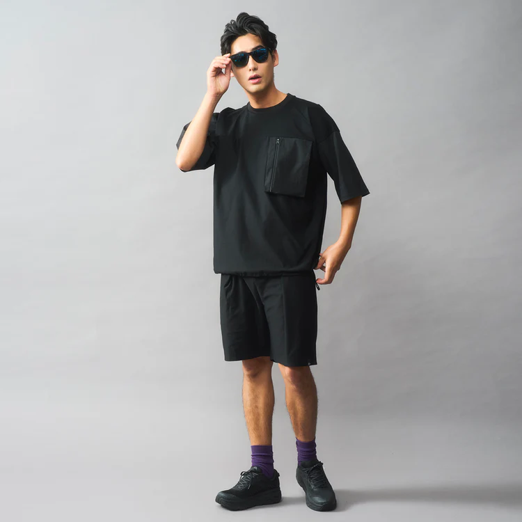 同素材のTシャツも展開。ショーツとセットで着れば、あっという間にる大人のカジュアルが完成〜! Tシャツの左胸のポケットに、T&ショーツをまとめて収納できるのもうれしいポイント。旅行や出張の移動着として使うのも吉。