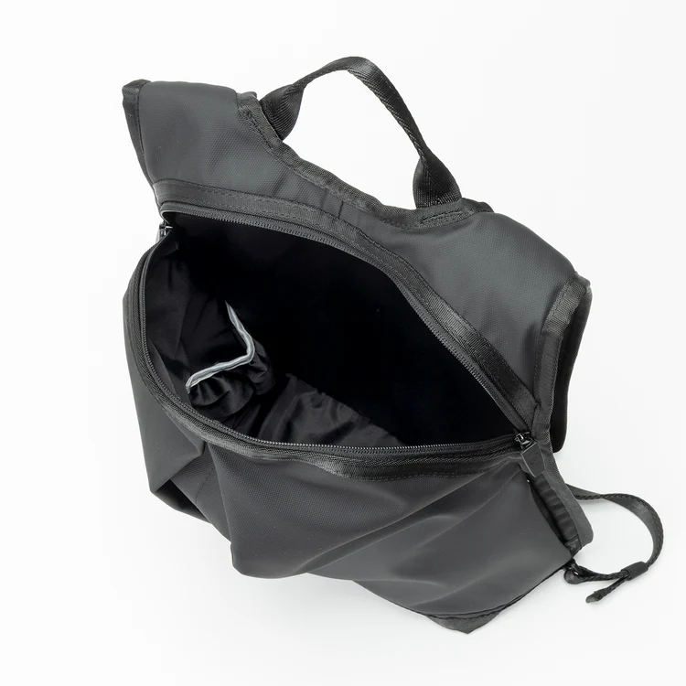 背中に添うような薄マチ設計の容量15ℓ。中心の大きなタックがデザインのポイント。防水・防汚性に優れたラバーライクなPU素材採用で急な雨や雪の日もへっちゃらだ。