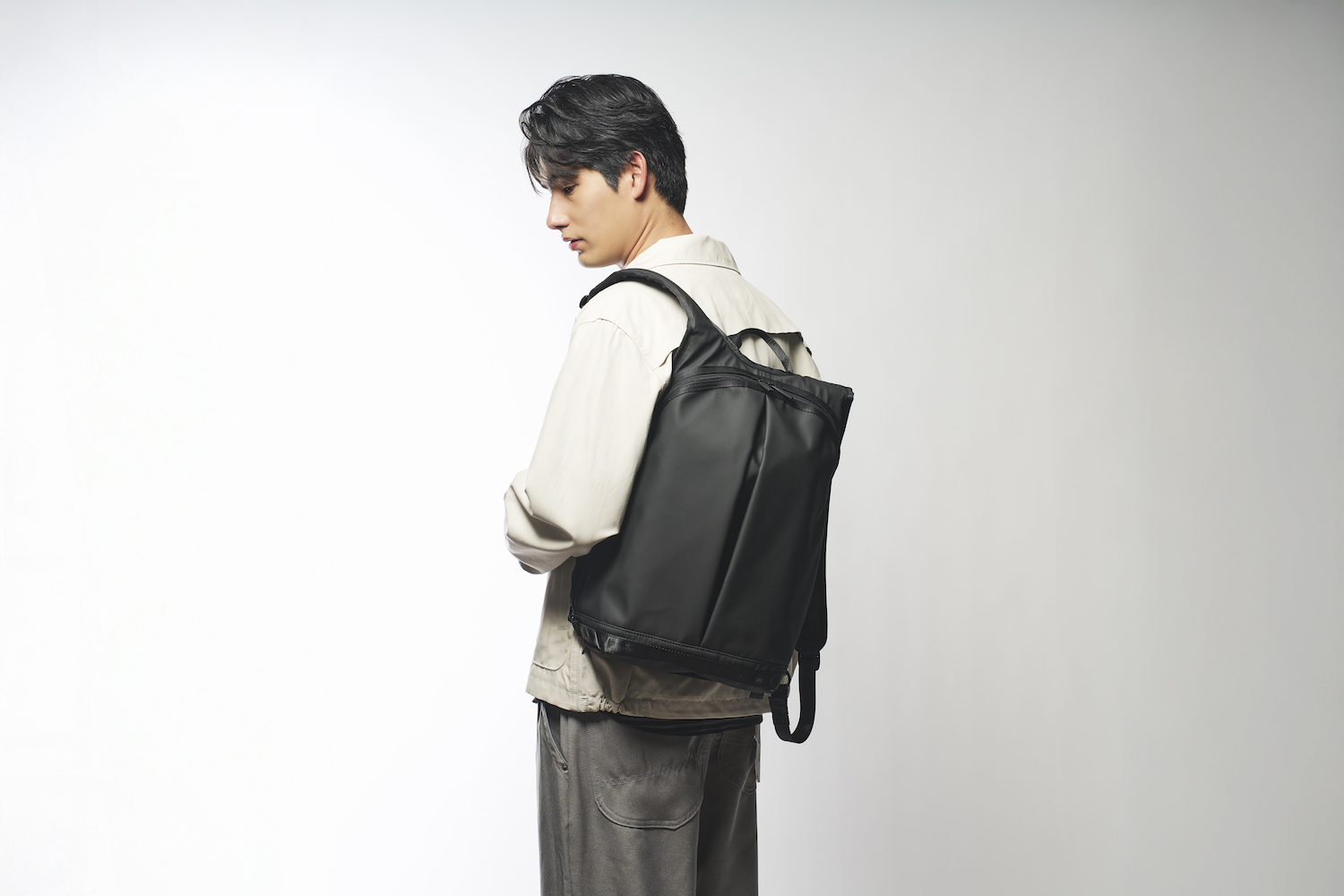 薄マチなのに整頓しやすく、マットな素材感でビジネスシーンでも浮かないバックパック。無駄を削ぎ落としたミニマルさがコーデを格上げしてくれる。