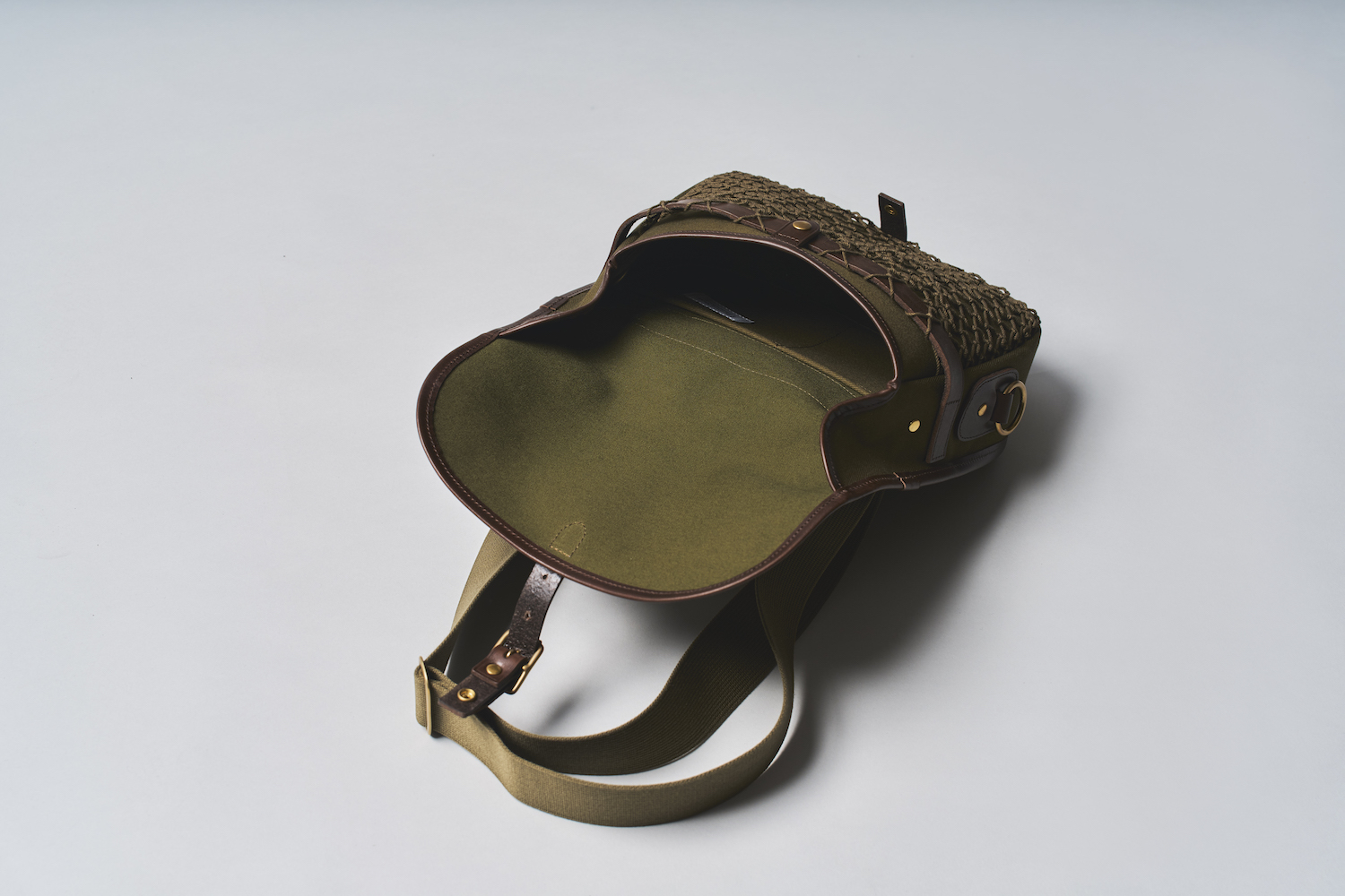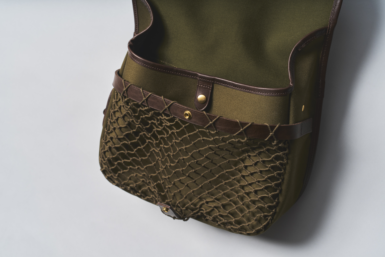 フィッシングバッグらしいディテールのフロントのメッシュポケットは、コットン紐を編み込んで染めたもの。レザーパーツには、国内タンナーでなめした厚口のベジタブルタンニンレザーを使っているので、使うほどに風合いが増していく。