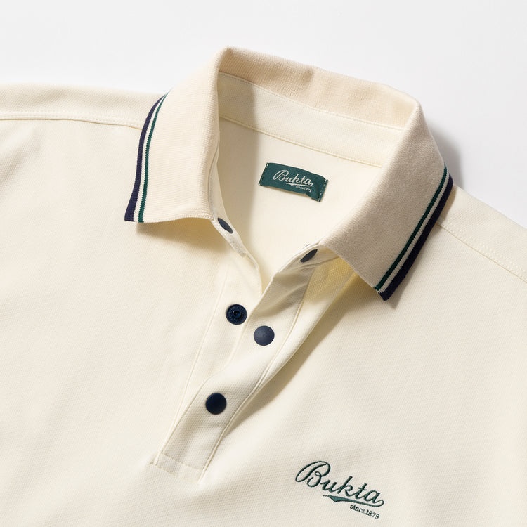 イギリス最古のスポーツブランド「バクタ」による、ラインリブのポロシャツ。ポリエステル100%の速乾素材で、通気孔を備えた機能的な一枚です。スナップボタン開閉により、着脱がしやすく快適な着心地を実現。