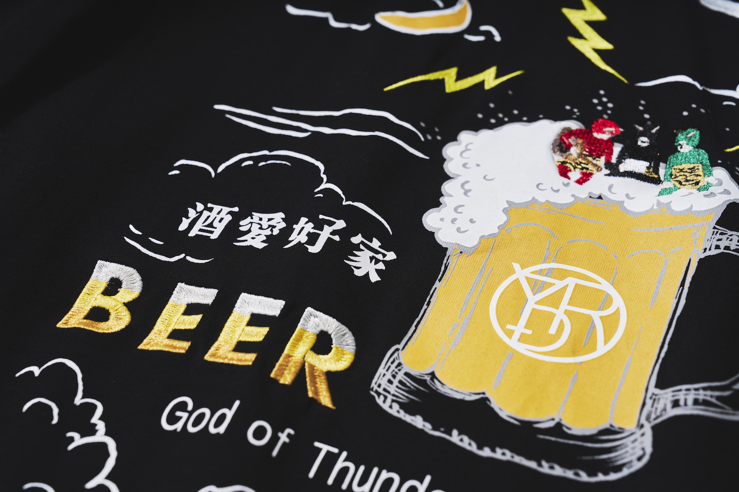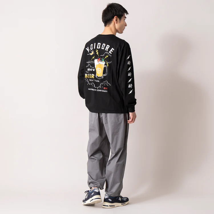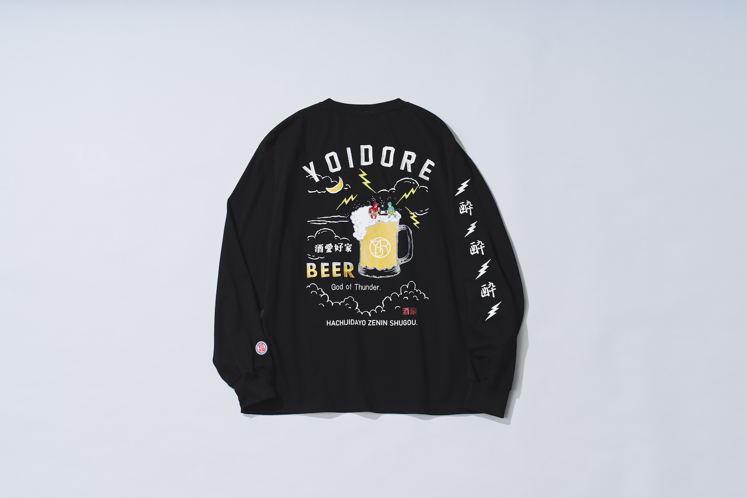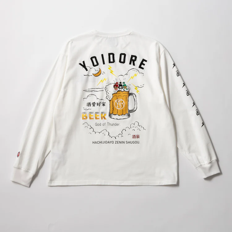 お酒をテーマにしたザインがユニークなYOIDOREから新作のKAMINARISAMA ロンTが登場。ロンT全体をキャンバスにKAMINARISAMAたちの呑みの場をにぎやかに表現!