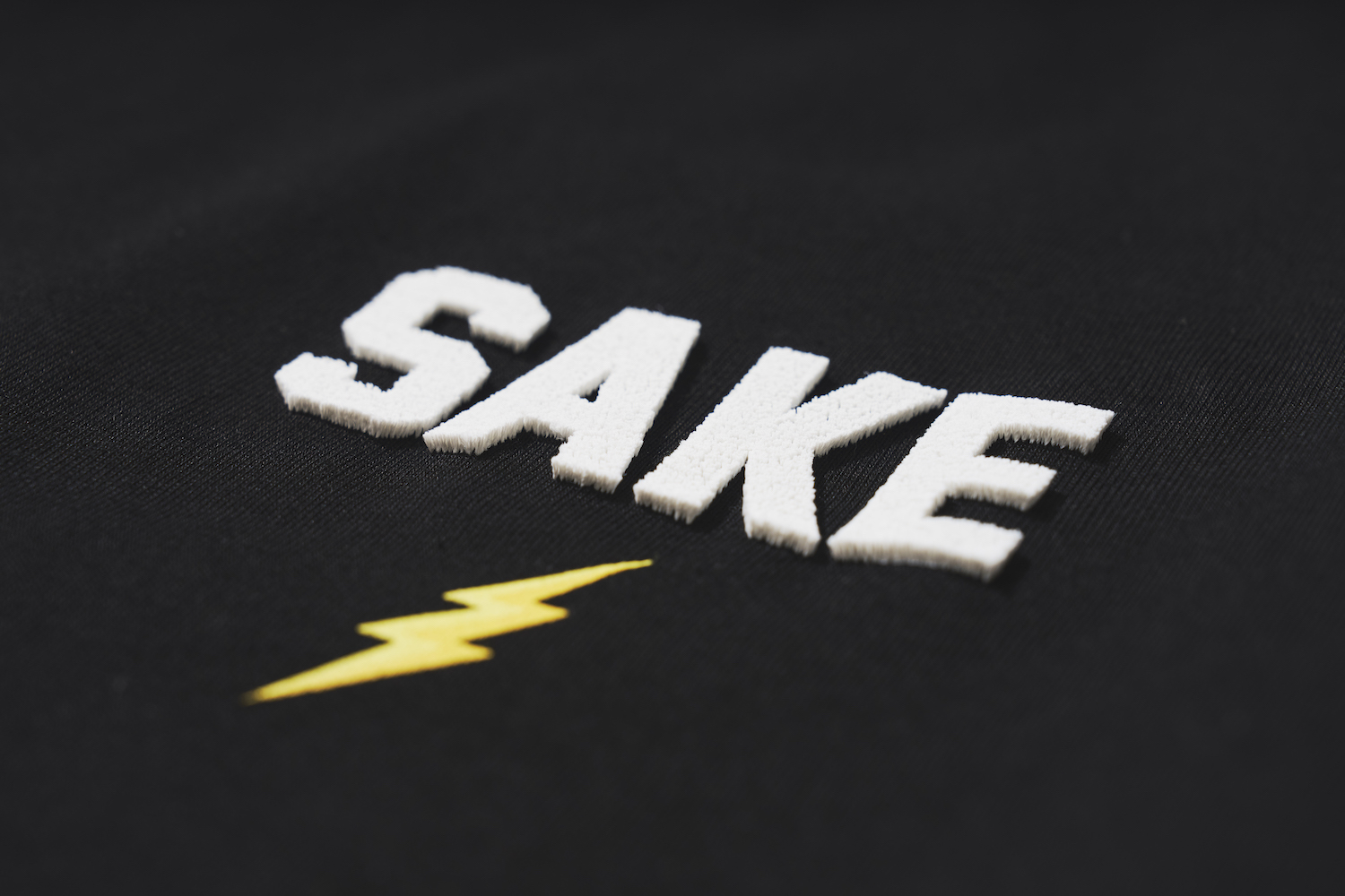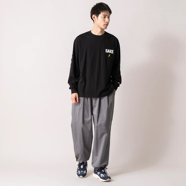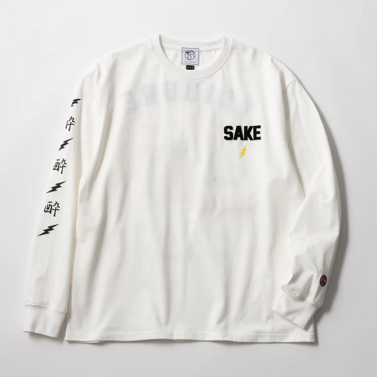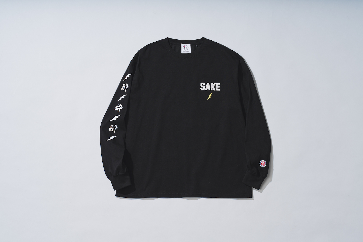 フロントの「SAKE」ロゴはブラシ刺繍で仕上げられ、平面的になりがちなロンTに奥行きのある表情をプラス。プリントとのMIXでギミックの効いた見え方を表現。