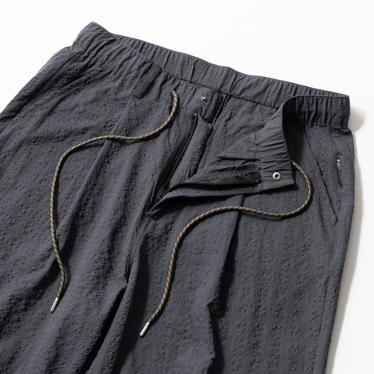 タック仕様で太ももに適度なゆとりを確保しながら、テーパードシルエットでスッキリと見える洗練されたシルエットがポイントです。ふんわりとした優しい肌触りと表面のランダムな凹凸で質感も涼しげ。きれい目コーデからアウトドアコーデなど、着こなしの汎用性が高く重宝します。