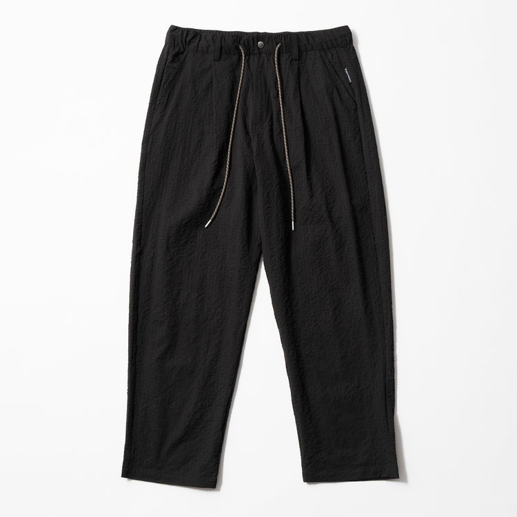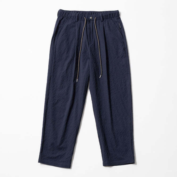 タック仕様で太ももに適度なゆとりを確保しながら、テーパードシルエットでスッキリと見える洗練されたシルエットがポイントです。ふんわりとした優しい肌触りと表面のランダムな凹凸で質感も涼しげ。きれい目コーデからアウトドアコーデなど、着こなしの汎用性が高く重宝します。