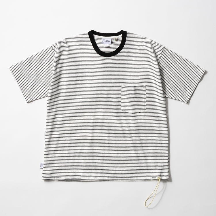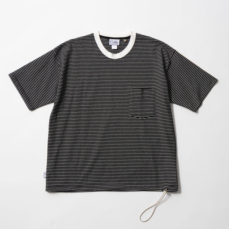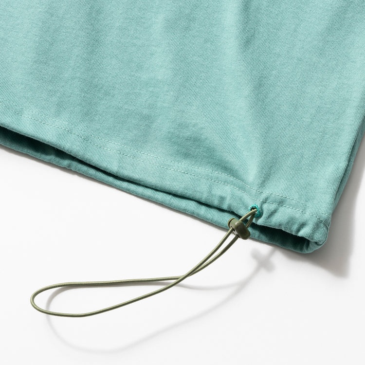 裾のドローコードでシルエットを調整できるってのが地味に便利。大きめなのに調整次第でスマートにも見えるし、ゆるっとカジュアルにも。スタイリングに合わせて着こなしに幅が出せるので、このタイプは夏トップスとして持っておきたい逸品ですね~。