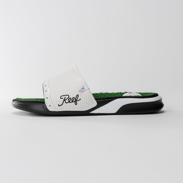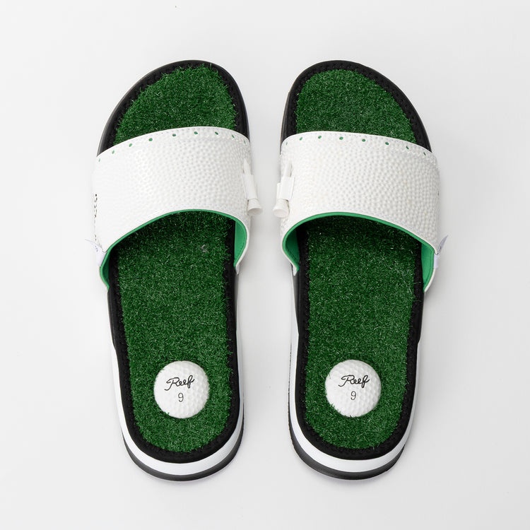 REEFの遊び心が爆発した『MULLIGAN SLIDE』。人工芝のフットベッドが足裏を刺激する、見た目以上に快適な履き心地。サイドに刺さったティーを手に取れば、今すぐコースに出たくなるかも?ゴルフ場での履き替え用としてはもちろん、日常の「つっかけ」を最高に面白いものに変えてくれる一足。足元からハッピーな話題を振り撒きましょう!」(オガワ)