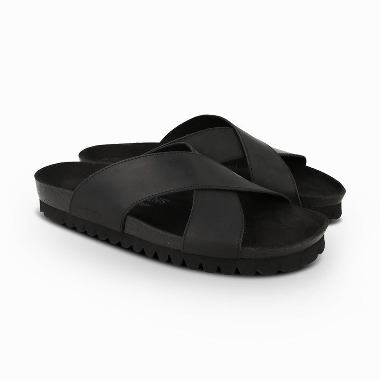 スペイン・バレンシア州で培われたレザー加工技術を結集した上質なレザーサンダルがこちら。足の甲を包み込む太めのクロスストラップが、ミニマルながら存在感のあるルックスを実現。フットベッドに立体的な凹凸を施し、歩行時の安定感と足への負担軽減を両立。厚みのあるシャークソール形状が、グリップ力と都会的なエッセンスを兼ね備えています。装飾を削ぎ落とした質感がカジュアルから洗練されたスタイルまで、幅広く対応します。デイリーユースからリゾートシーンまで、足元に上質なニュアンスを添える逸品です。