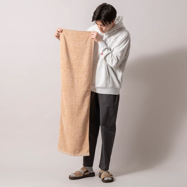 幅はフェイスタオル、長さはバスタオルなW34×H120㎝。ハンガーにも掛けられるサイズ感で、お風呂上りもこれだけで十分な吸水力を発揮。