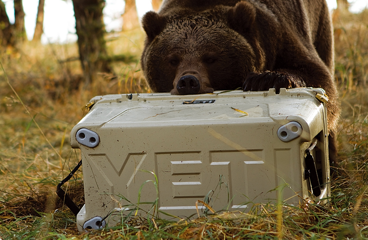下の写真はnotCG。耐久テストのためマジで熊と対決している一幕。結果同社製品はビクともせず、米国のグリズリーベア委員会が定めるベアレジスタンス容器の基準をクリア。世界最強クーラーボックスとして名を馳せたのでした。W50.8×H34.1×D36.8cm。3万2000円。(A&Fカントリー本店)