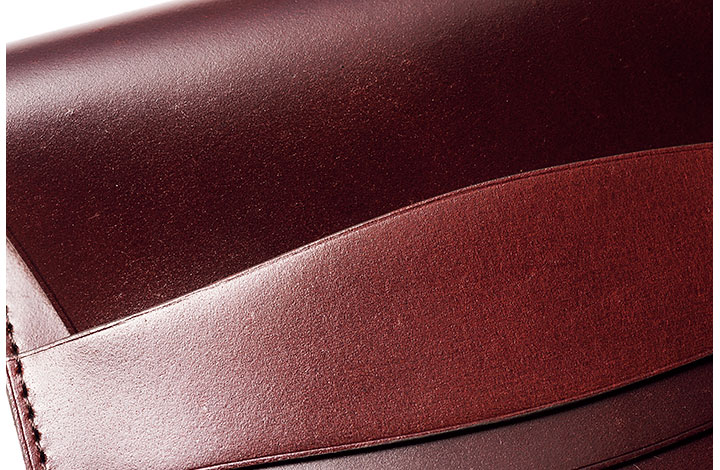 コードバンを革小物に適した厚みまでスプリットした後、ホースハイドと特殊な接着剤で圧着。適度な厚みとなって、フラップの折り目や艶めかしいドレープ感を生み出している。