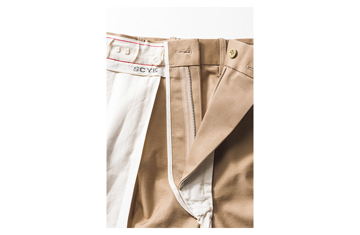サイベーシックスのチノは、サンホアキン綿という美光沢な骨太素材が人気で、その名作が今季ツータック化。