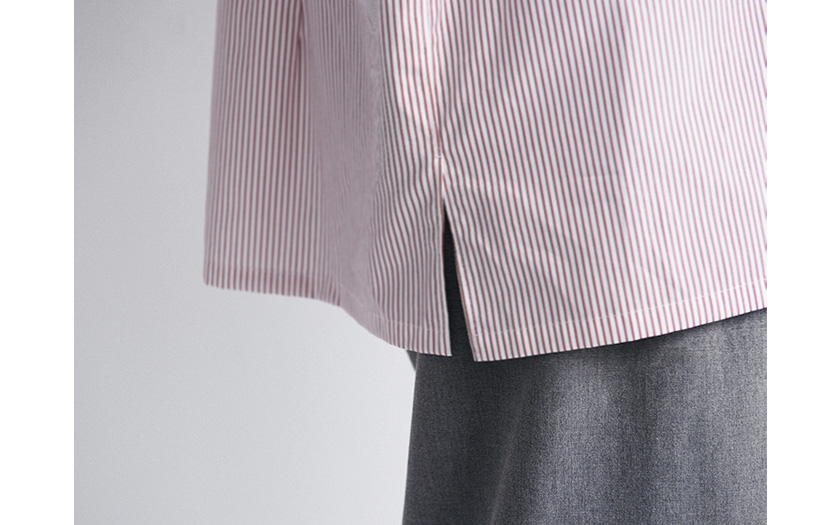 形の美しい衿やフラシ芯の入ったカフス、スクエアカットの裾など、クラシカルなドレスシャツのディテールを踏襲しながらも、エフォートレスな雰囲気漂うビッグシルエットに仕立てました。2万7000円。