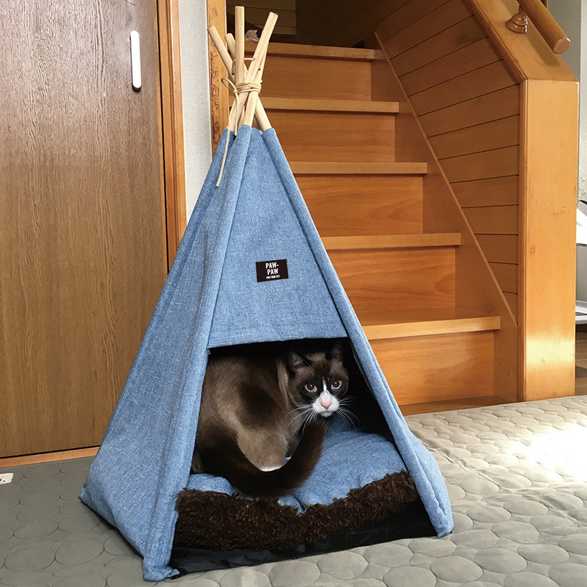 インテリアやお洒落にこだわる人にとって、ペットのアイテム選びは至難のワザ。だって、ホントに納得できるモノって少ないんですから。折しも家キャンプやベランピングを実践する人が増えている今、ペットにだってアウトドア気分を体験させてあげたい! な~んて思うのも当たり前なのであります。そんな今の気分にぴったりなのがこちらのテント型ペットベッド。ワンポールのティーピーテントをモチーフにしたもので、洗練されたアウトドアテイストが絶妙です。狭いところが好きなネコちゃんはもちろん、小型犬にも対応し、入り口から顔を出すペットの姿がかわいすぎ~♪ 中のクッションは、表面はテントと同じ生地ですが、裏面はフッカフカのボア素材なので寒い季節だって安心です。ねっ、これならインテリアにも違和感なくハマるでしょ? W63×H82×D62cm。5000円。
