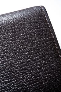 ゴートとはヤギのこと。その革は繊維が充実していて、その分、薄くても堅牢で、耐摩耗性と耐傷性も抜群。また、軽くて弾力性に富み、それでいて型崩れしにくいから、ずっとキレイに使えるという特性も!(写真上参照)。と、このような優れた特性から、じつは欧米では革小物の最適素材と評価されてきたんです。で、なかでも仏・アルラン社のゴートレザーは繊維が整い、表情に気品があり、発色が激美ゆえ、某高級メゾンも御用達というプレシャスレザーなのです!