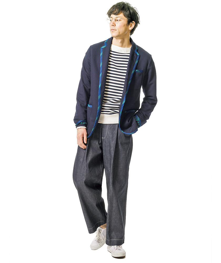 スウェットブレザーはもともとカジュアル寄りだから休日コーデに馴染ませるのも比較的簡単。逆にラフになりすぎないよう、合わせと小技を意識したい。