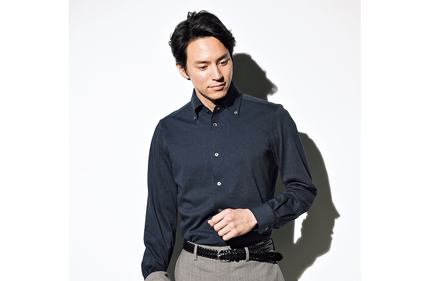 ストレッチを利かせたカノコ素材のシャツ。通気性や吸水速乾性を備えているので、盛夏のビジネスシーンで頼りになること確実。ネイビー×ボタンダウンはノータイでもサマになる。1万4000円(エストネーション)