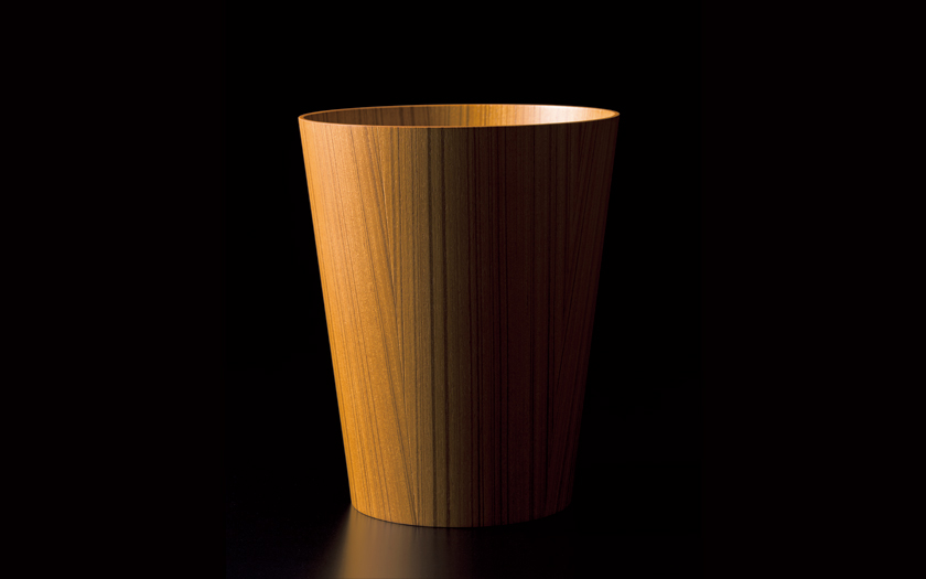 注視しなければわからない木の繋ぎ目が高度な技術をうかがわせる。薄く軽いが強度は高く、汚れにも強い。Φ25.5(18)×H30cm。903を含め計3サイズを展開。カラーは写真のチーク・グレイン他2色。4700円。(サイトーウッド)