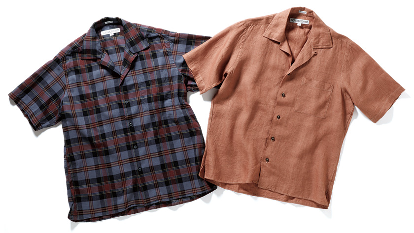 シャツの定番、インディビはカスタムメーカーだけに、半袖シャツの支持にもたしかな個性が。ともにゆったりめのアスレチックフィットだが、東はリネンの開衿で、無地でも素材、色使いの細かな妙味が。