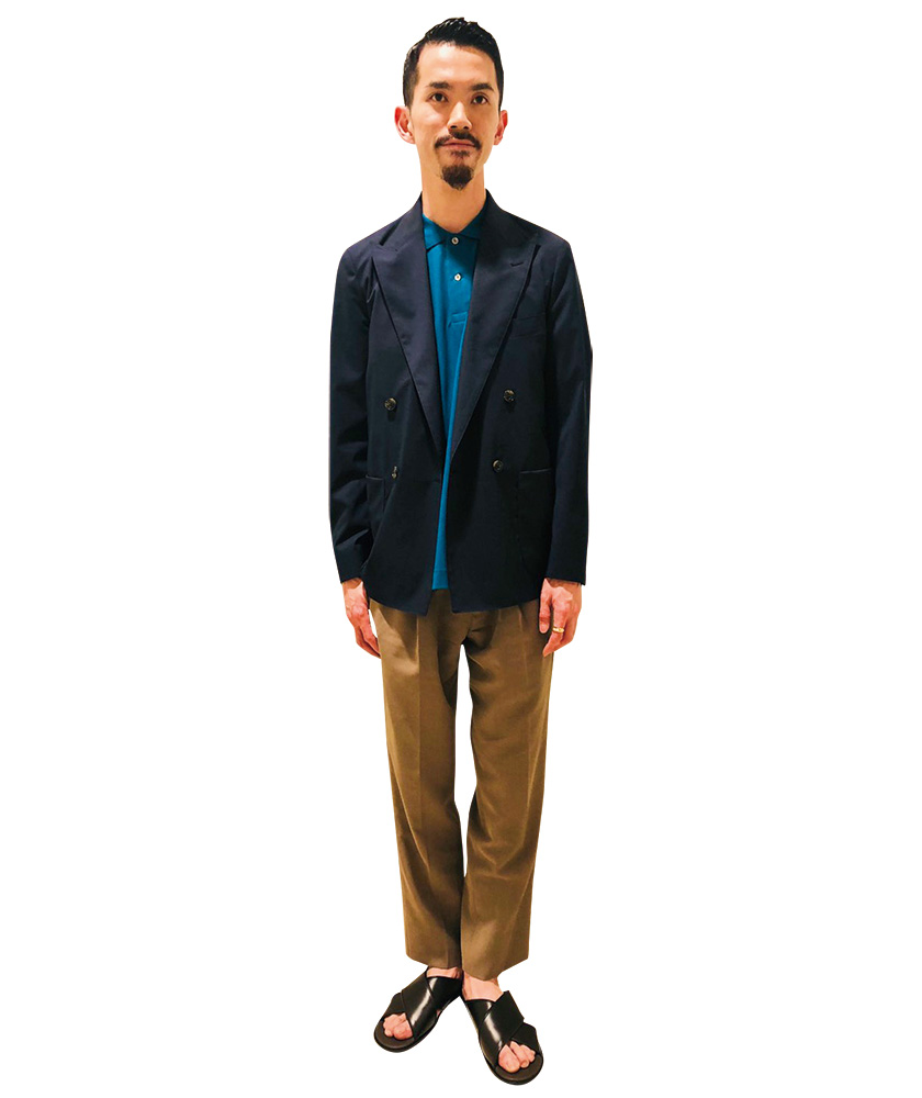 今季は美しいコバルトブルーが一番人気。一枚でも絵になるし、僕らとしてはオーセンティックなジャケットスタイルを涼やかに見せる着こなしに注目。紺ジャケ、チノに革サンダルでヒト捻り加えた、“心斎橋プレップ”です。(井上さん)