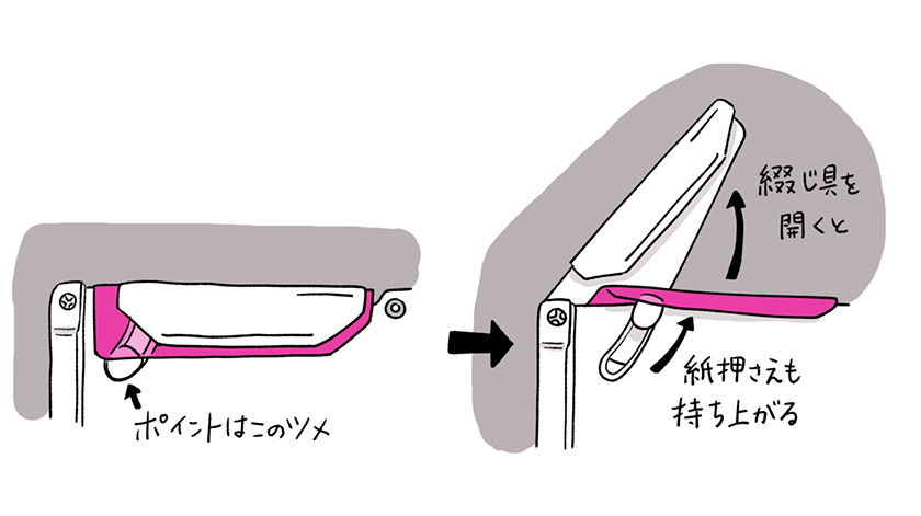 スライド式の綴じ具の下には、PP製の紙押さえが付いており、紙をセットするときに綴じ具が紙を巻き込まないようになっている。特に気が利いているのは、綴じ具と一体になったツメが、開く動作に連動して紙押さえを「どうぞ~」と言わんばかりに持ち上げる仕掛け。用紙を抜き差しする際に、こちらは紙押さえにまったく意識を向ける必要がないのが心憎い。
