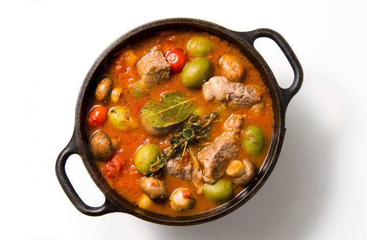 | 2 | ミニトマト、グリーンオリーブ、マッシュルーム、潰したトマト水煮、ジャガイモなど残りの食材を加え、蓋をして強火で熱し、沸騰したら極弱火にし、20分煮込む。 |