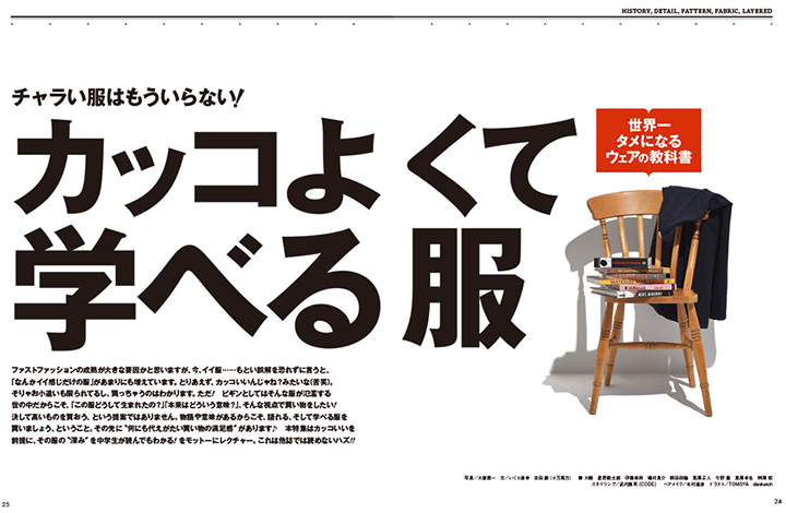 ファストファッションの成熟が大きな要因かと思いますが、今、イイ服……もとい誤解を恐れずに言うと、「なんかイイ感じだけの服」があまりにも増えています。とりあえず、カッコいいんじゃね?みたいな(苦笑)。そりゃお小遣いも限られてるし、買っちゃうのはわかります。ただ! ビギンとしてはそんな服が氾濫する世の中だからこそ、「この服どうして生まれたの?」「本来はどういう意味?」、そんな視点で買い物をしたい!決して高いものを買おう、という提案ではありません。物語や意味があるからこそ、語れる、そして学べる服を買いましょう、ということ。その先に"何にも代えがたい買い物の満足感"があります♪ 本特集はカッコいいを前提に、その服の"深み"を中学生が読んでもわかる!をモットーにレクチャー。これは他誌では読めないハズ!!