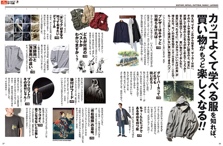 例えば、です。これから始まる「サッカーW杯」、そのルールや選手を知らずに観るのと、完全に把握して観るのとどちらが楽しめるでしょうか?答えは明白でしょ? 買い物だっておんなじ。前頁に述べたように「なんかカッコいいだけの服」が増えた今、モノの本質を知る(ビギンの信条です!)ことで、も~っと楽しく間違いない買い物ができるハズ!